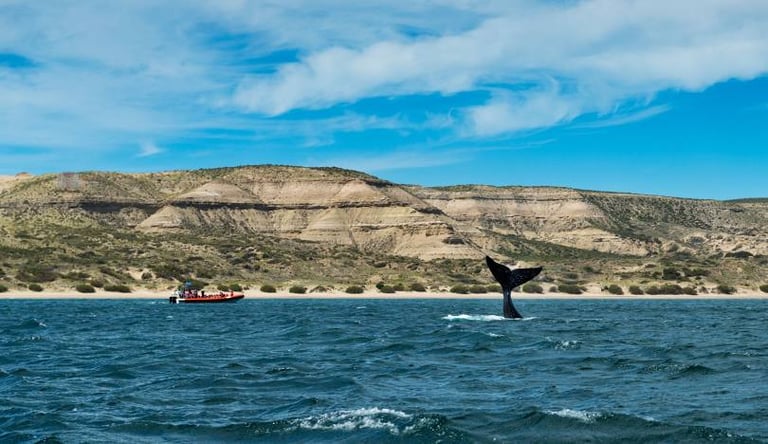Dia 4 - Puerto Madryn | Peninsula Valdes: Nos dirigiremos hacia Puerto Pirámides, desde donde embarcaremos en una navegación para observar a las majestuosas ballenas francas australes. (disponible hasta el 10 de diciembre) Además de las ballenas, la Península Valdés es hogar de una gran diversidad de fauna, incluyendo elefantes marinos, lobos marinos, pingüinos y cormoranes. Al finalizar la navegación, regresaremos a Puerto Madryn para pasar la noche. Esta ciudad costera es famosa por su ambiente relajado y su oferta gastronómica, destacando los mariscos frescos.