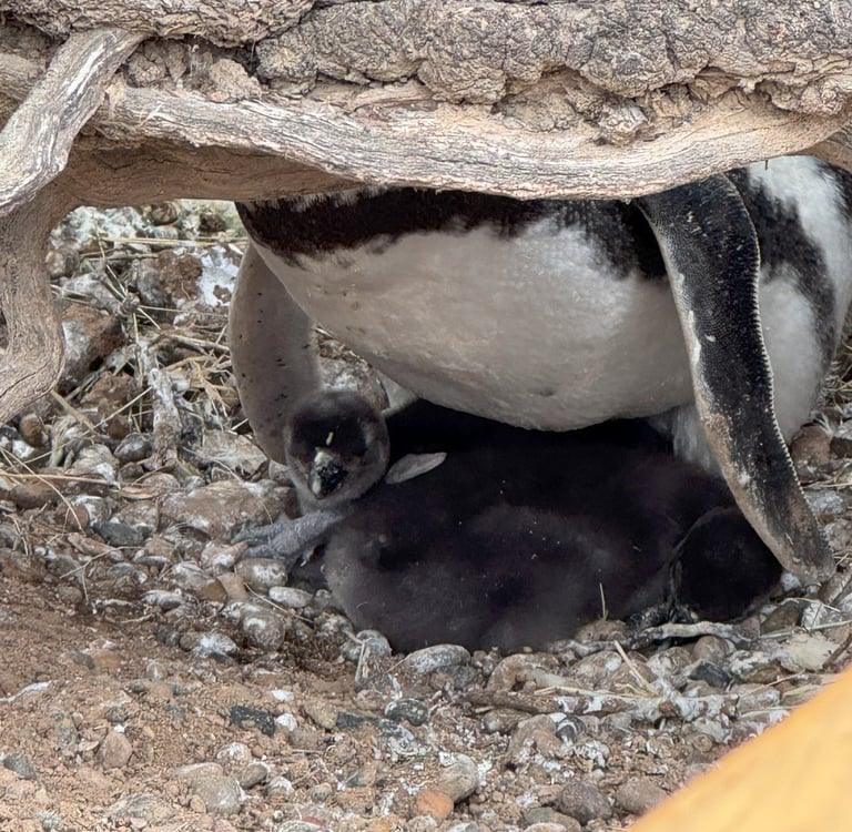 Durante la temporada de reproducción, que comienza en septiembre, los pingüinos de Magallanes regresan a sus colonias y buscan el mismo nido que utilizaron el año anterior. Son aves monógamas y suelen formar parejas de por vida. La hembra pone dos huevos y ambos padres se turnan para incubarlos durante unos 40 días. Cuando los pichones nacen, están cubiertos de un plumón gris y dependen completamente de sus padres para alimentarse hasta que desarrollan el plumaje impermeable que les permitirá nadar en el océano.